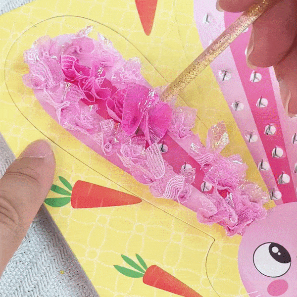 Place the fabric art boards on top of the provided pearl cotton foam, select colored fabrics, and use the stylus art stick to poke them through the holes on the boards.